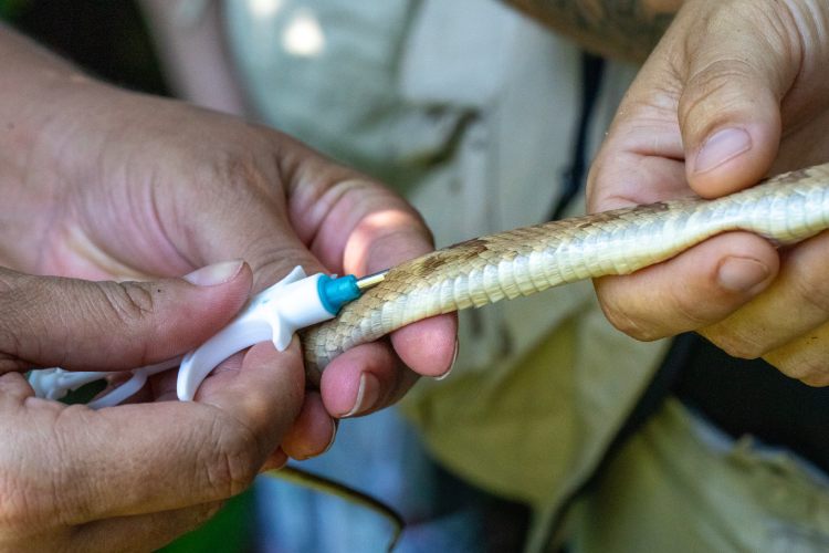 Com a ajuda do chamado “pinção”, o biólogo e pesquisador associado do Laboratório de Coleções Zoológicas do Instituto Butantan Fausto Erritto Barbo realiza a captura da serpente. Posteriormente, com o auxílio de um gancho e técnicas de manejo, ela é colocada em um tubo de contenção – essa é parte mais complexa da captura – e passa por uma avaliação completa. Após uma primeira inspeção visual e tátil, os especialistas constatam que o animal está hidratado e saudável. Em seguida, é feita a medição: o espécime mede cerca de 70 centímetros. Também é coletado um fragmento de escama que contribuirá com trabalhos de mapeamento genético, assim como uma amostra da região cloacal para verificar se há ou não presença de sêmen – o objetivo é analisar a biologia reprodutiva dos machos e a qualidade dos espermatozoides.