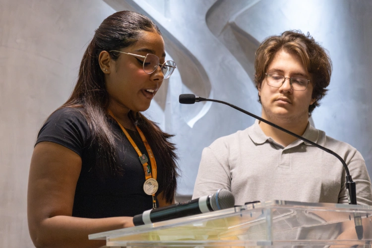Os integrantes do Cientista Mirim 2025 foram representados pelos alunos Maria Eduarda Queiroz da Silva e Theo Camargo Rodrilla, oradores da turma. Emocionados, eles agradeceram aos professores, pesquisadores e orientadores que tornaram a experiência do programa possível e completa, destacando a relevância da iniciativa para a compreensão, na prática, de como a ciência acontece e que lugar ela ocupa na sociedade. “O programa subverte uma noção de ciência como algo distante e difícil. É o início de uma conscientização e tomada do poder científico, uma forma de nos unirmos e conseguirmos melhorias para o mundo”, pontuou Theo.